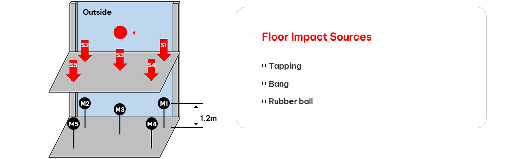 - 가진점 : 중앙점 포함 총 5지점, 벽체에서 0.75m(면적 14㎡이하시 0.5m) 이격